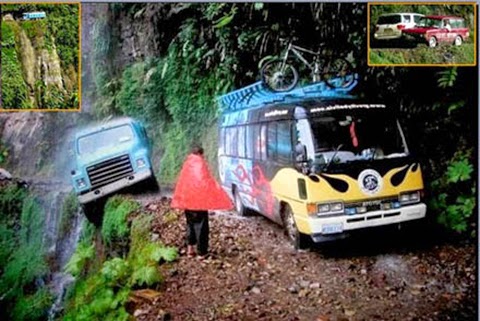 Estrada da Morte (“Camino a los Yungas”), que une La Paz a Coroico, no nordeste da Bolívia (média de 96 mortes por ano). Na descida, há motoristas que usam a contramão para poder ver os abismos