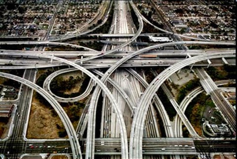 Interseção Harry Pregerson, espetacular conjunto de viadutos em Los Angeles, que permite coordenar o trânsito local com a passagem de duas rodovias estaduais da Califórnia, as Interstates I-105 e I-110, nos EUA